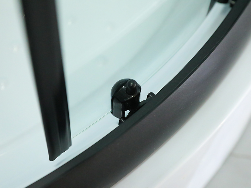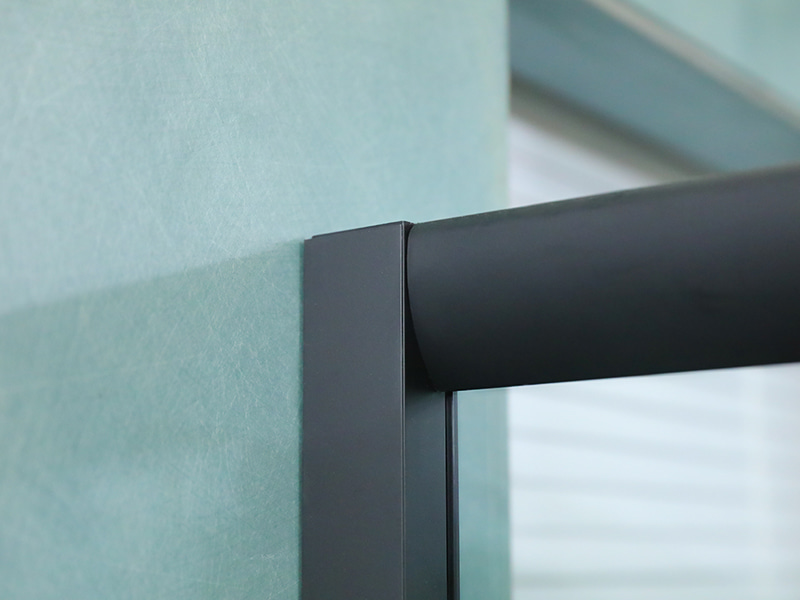 Przezroczyste szkło hartowane z nadrukiem, czarny profil aluminiowy, uchwyt z podwójnymi otworami, z tacą